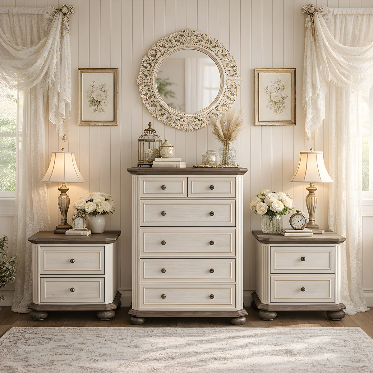 Bring rustic elegance home with this farmhouse-inspired entertainment center featuring distinctive grooved door panels and your choice of white/black or brown/gold color combinations.