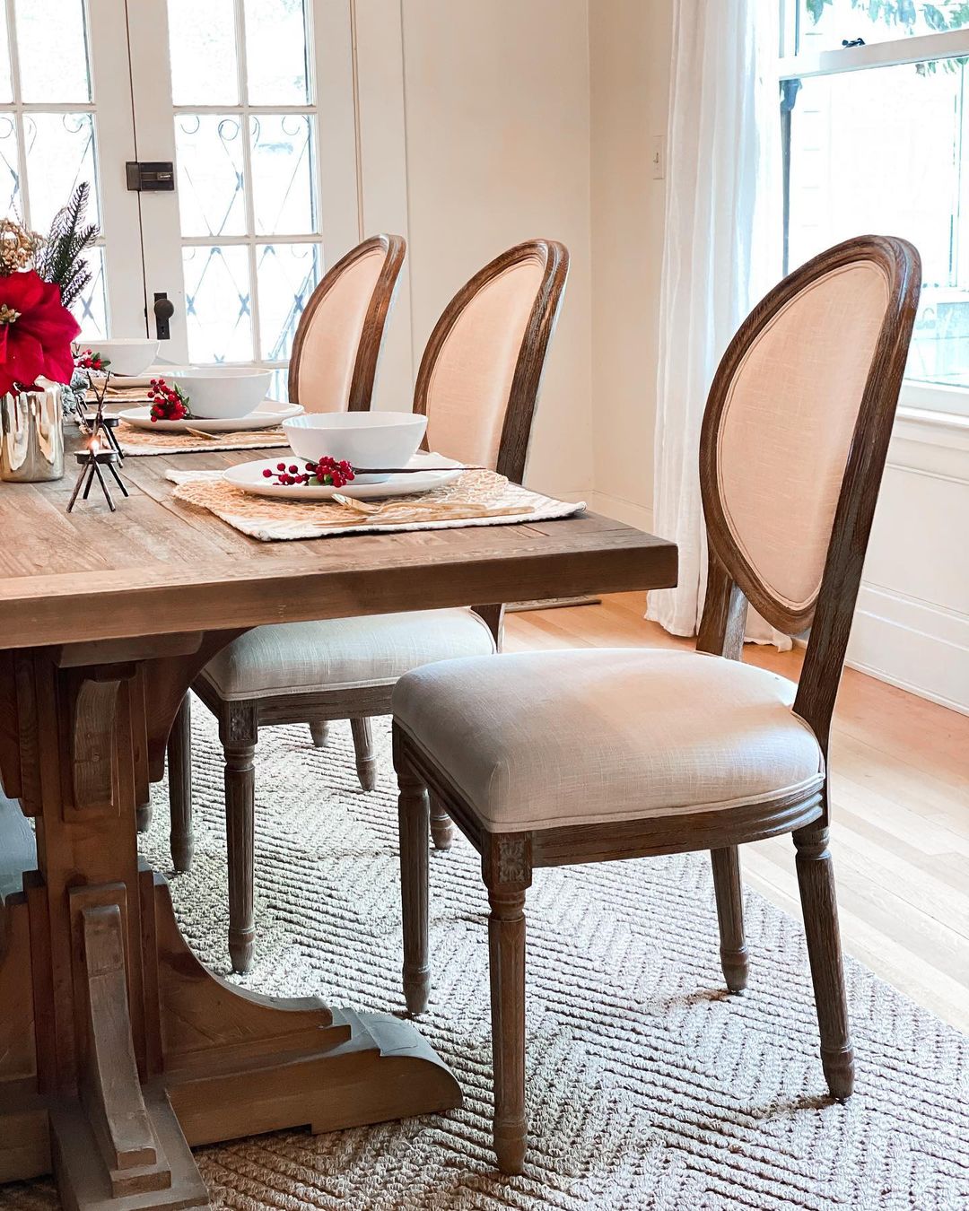This set of two round-back chairs is a perfect addition to your home's decor. You and your family will feel the best qualities of a warm and comfortable home with these mid-century dining chairs that are strong, sturdy, ergonomic, and comfortable. This farmhouse dining chair's natural wood engraved frame and brushed legs add a Louis-style and French aesthetic that are aesthetically pleasing without standing out too much. This vintage chair is a total chic luxury to express your personal taste and style.