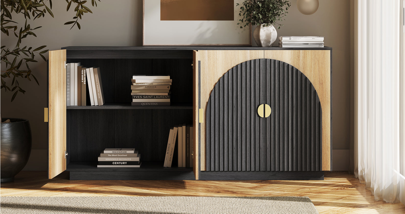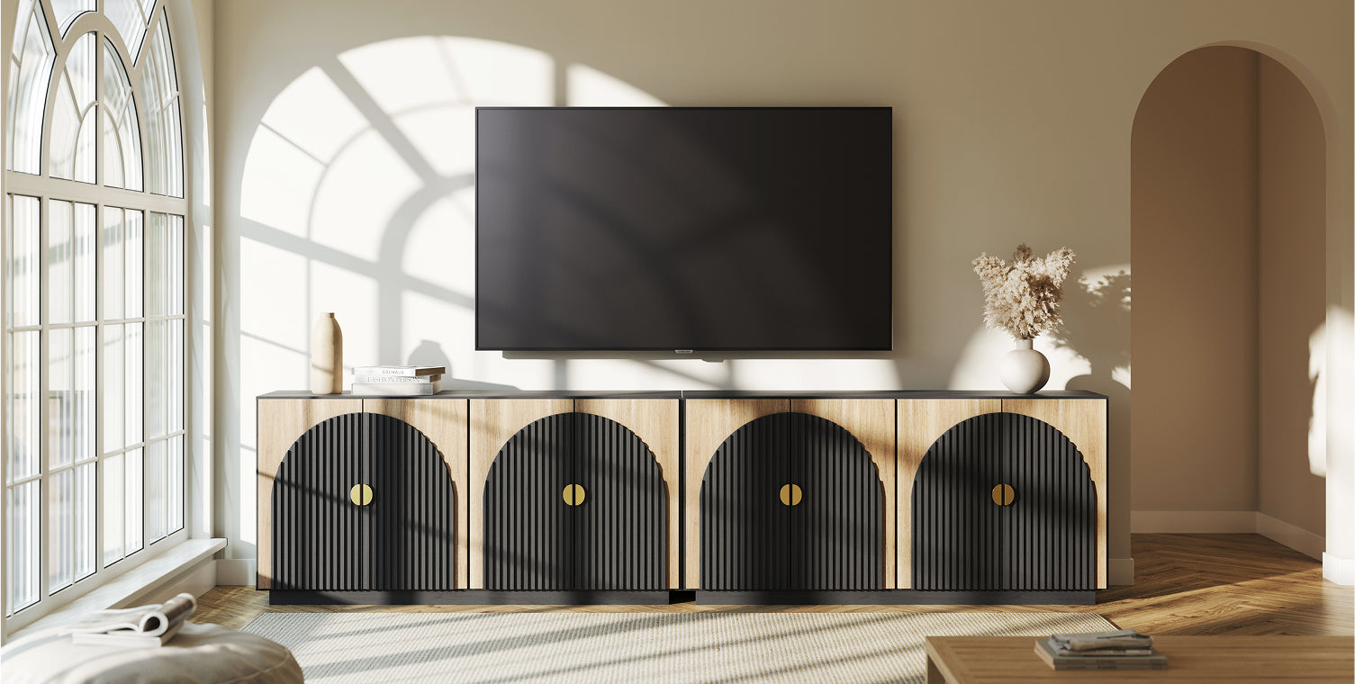 Elevate your living room with this stunning fluted TV stand, designed to blend style and functionality. Featuring a sleek fluted design with arched doors and elegant gold semi-circular handles, this piece adds a modern touch to any space.