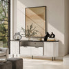 This isn't just a TV stand; it's a statement piece. This 68-inch TV Stand is designed for those who appreciate modern luxury. Its unique curved design masterfully blends the soft, sandy-white texture of its body with the dramatic elegance of a black marble-look top, creating a stunning focal point for your living room.