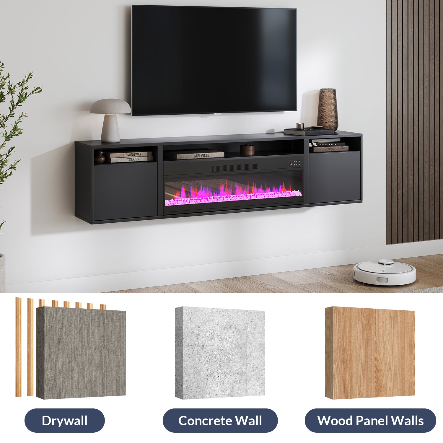 Elevate your entertainment setup with this versatile floating TV stand. Its adaptable wall mount works seamlessly on drywall, concrete, or wood panel walls. The sleek black design saves space while adding modern flair. Enjoy the cozy ambiance from the built-in fireplace, perfect for movie nights or relaxing evenings in any room of your home.