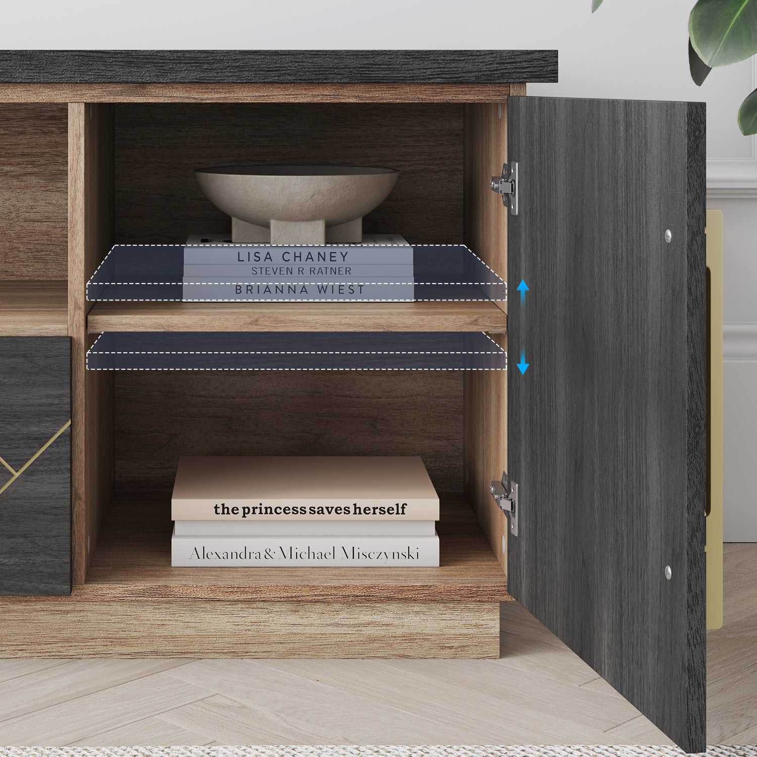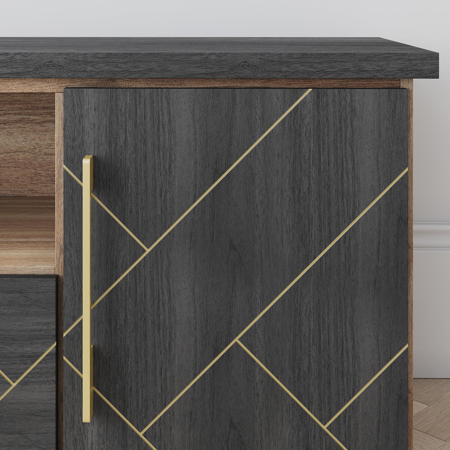 This sophisticated TV stand seamlessly blends dark wood tones with eye-catching brass inlays, creating a contemporary geometric pattern that adds character to any living space. The natural wood frame and ample storage make it both a practical entertainment center and a striking conversation piece.
