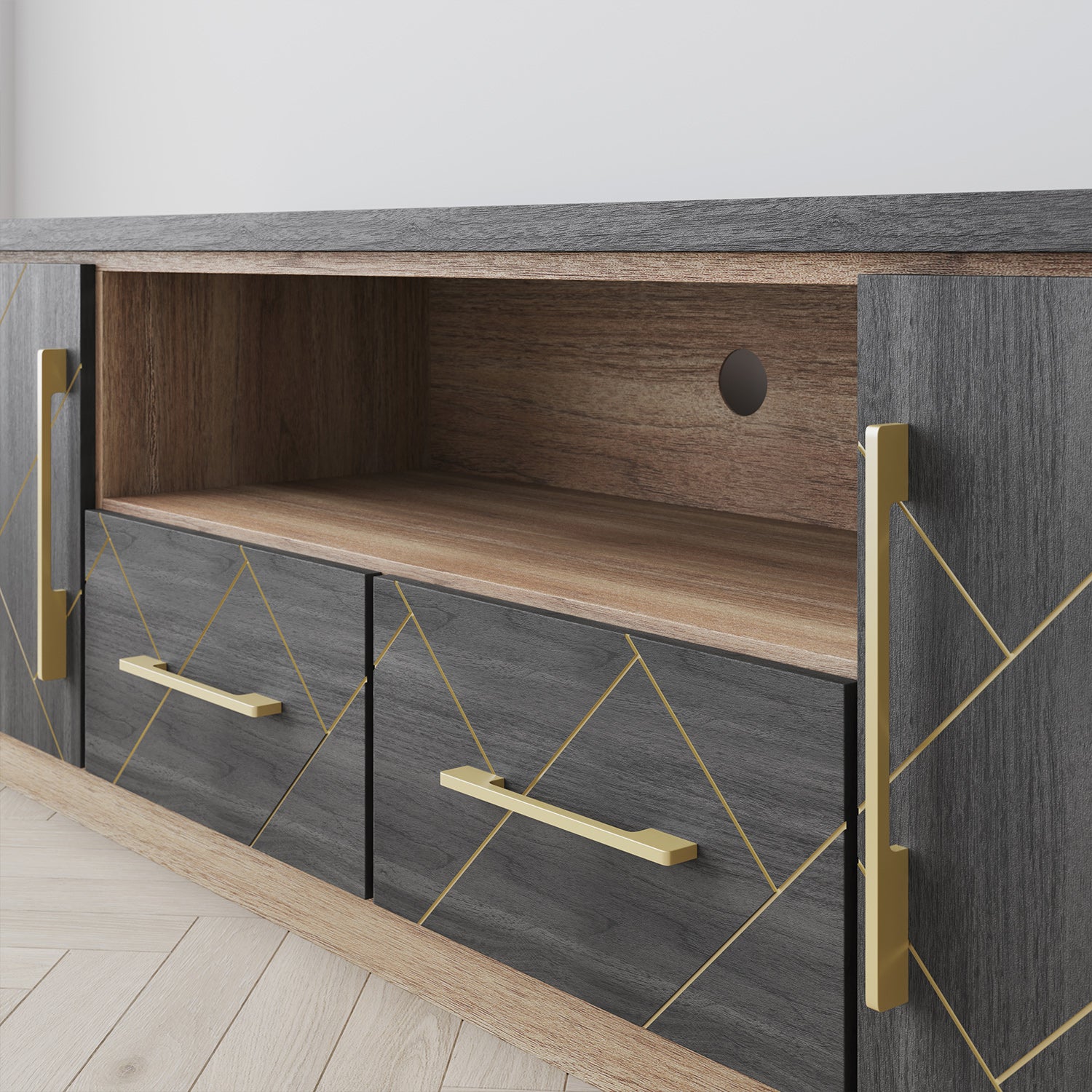 Keep your living room organized with this thoughtfully designed TV stand. A generous open compartment gives you room to breathe for cable boxes and gaming consoles, while two spacious drawers below handle DVDs, games, and other entertainment essentials. The gold geometric accents add a designer touch.