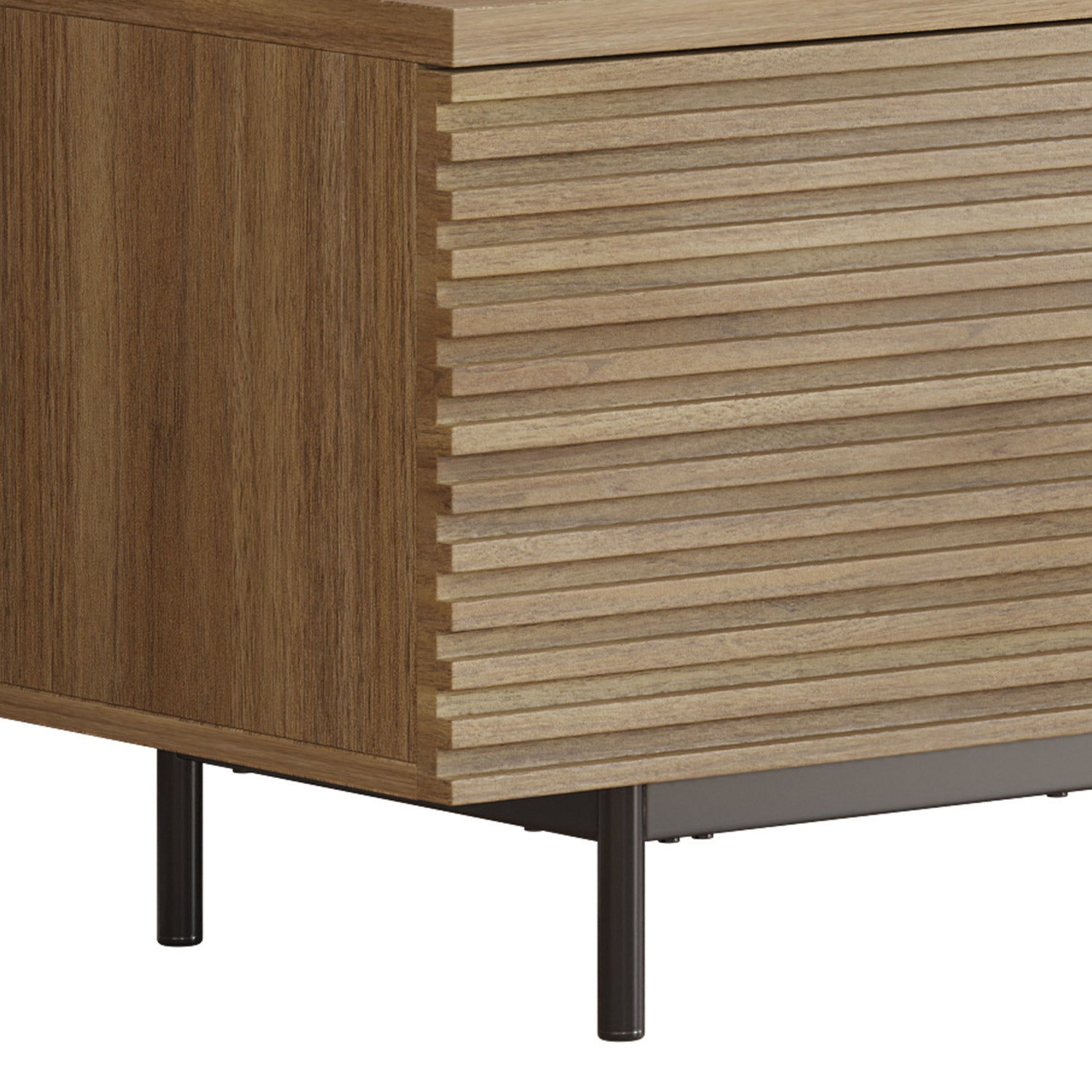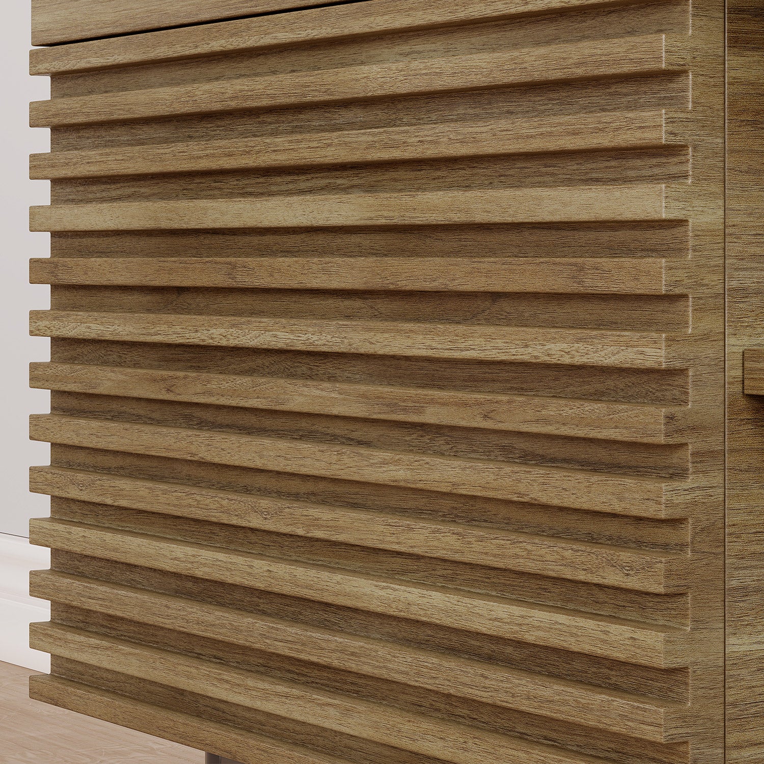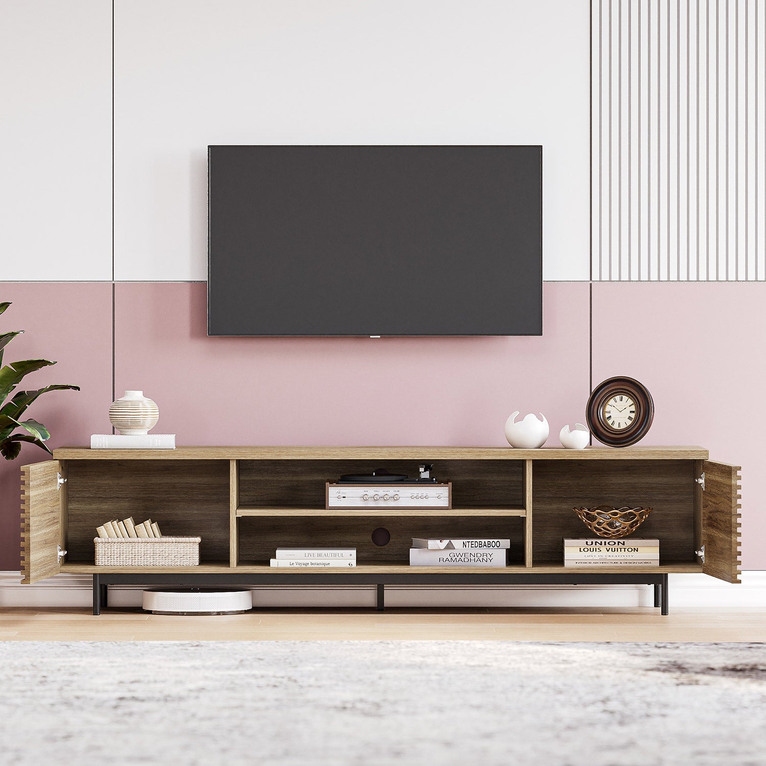 Transform your living space with our versatile 68-inch mid-century modern TV stand, combining ample storage, modern style, and sturdy construction. Featuring two cabinets with doors, and two open shelves with adjustable shelving, it keeps your items organized while wire holes at the back maintain tidiness. The slatted door design, complemented by the harmonious blend of the main body and bottom base, adds sophistication to any room. Crafted from premium materials, it ensures durability and stability with a weight capacity of 70 pounds.