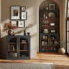 The belleze modular cabinet measures 15.75"D x 32.5"W x 31.9"H and works alone or combined with hutches, dressers, or additional units to create a,sideboard cabinet, or modular wall unit. Its arched glass doors and clean modern lines add elegance to dining rooms, living spaces, or entryways. With 3 tiers and 2 adjustable shelves, it stores dinnerware, books, or decor neatly. Crafted from durable MDF and featuring exclusive chopstick-style aluminum alloy handles-black on both ends with a golden center-it combines quality and subtle luxury. Easy to assemble and securely packaged for delivery, this cabinet provides a stylish, functional, and versatile storage solution for any home.