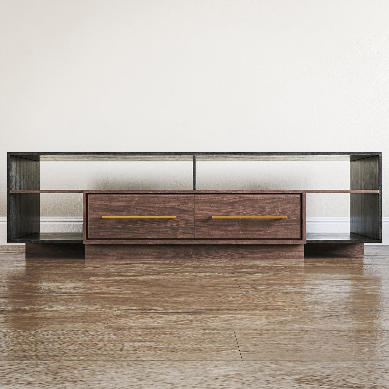 This understated TV stand combines clean lines with practical storage, featuring rich walnut drawers and brass handles that add warmth to any room. The open shelving design keeps media components accessible while maintaining a sleek profile that won't overwhelm your space. Perfect for modern homes where style meets functionality in everyday living.