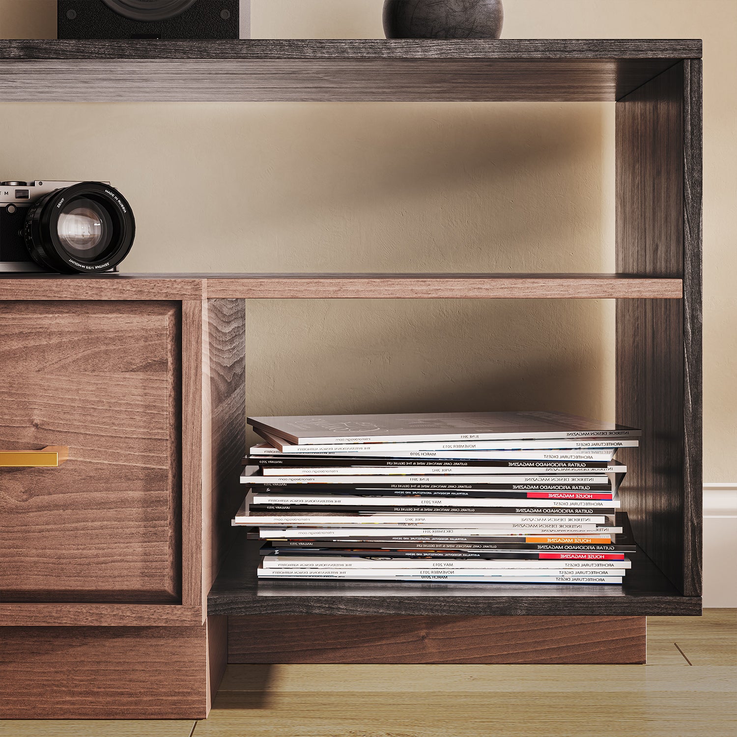 Live like a curator in your own space. This isn't just another TV stand β it's where your vintage camera collection meets your coffee table books, all wrapped in rich walnut tones. Smart storage meets visual poetry with dual drawers that keep life's essentials elegantly hidden while open shelving creates breathing room for inspiration.