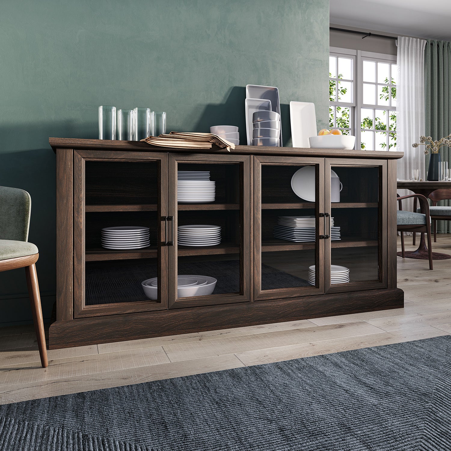 Behind those handsome glass doors, this brown sideboard turns everyday dishes into an artful display. The spacious shelves keep dinnerware organized yet easy to grab, while the wood construction adds warmth to your dining space. Perfect for both special occasions and daily meals.