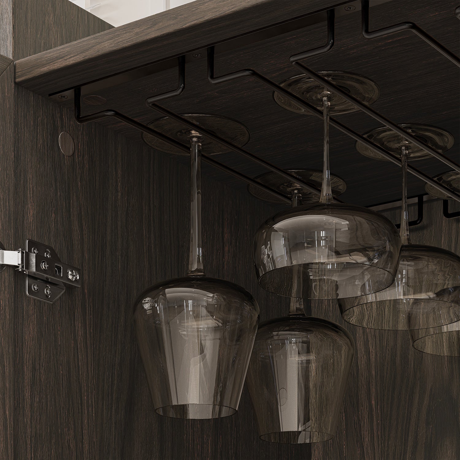 This handsome 55" wine cabinet keeps your favorite glasses at the ready, suspended elegantly from dark wood shelving. The smooth-gliding holders protect up to 6 stemware pieces, adding both function and sophistication to your dining space or bar area.