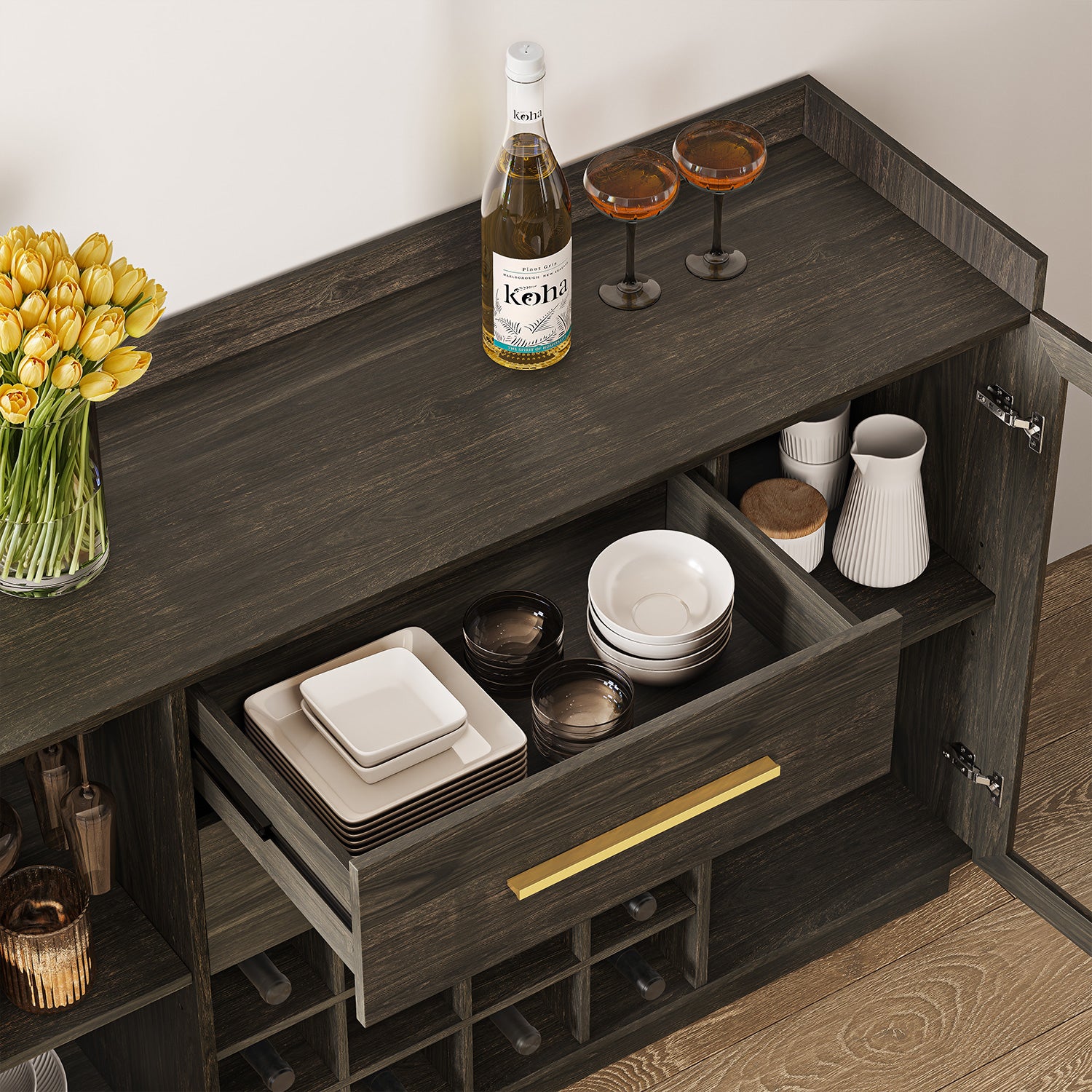 This 55" wine cabinet combines style with smart storage – dedicated spots for wine bottles, elegant dinnerware, and serving essentials. The spacious tabletop creates an ideal serving area, while two smooth-gliding drawers keep your entertaining must-haves neatly organized and close at hand.