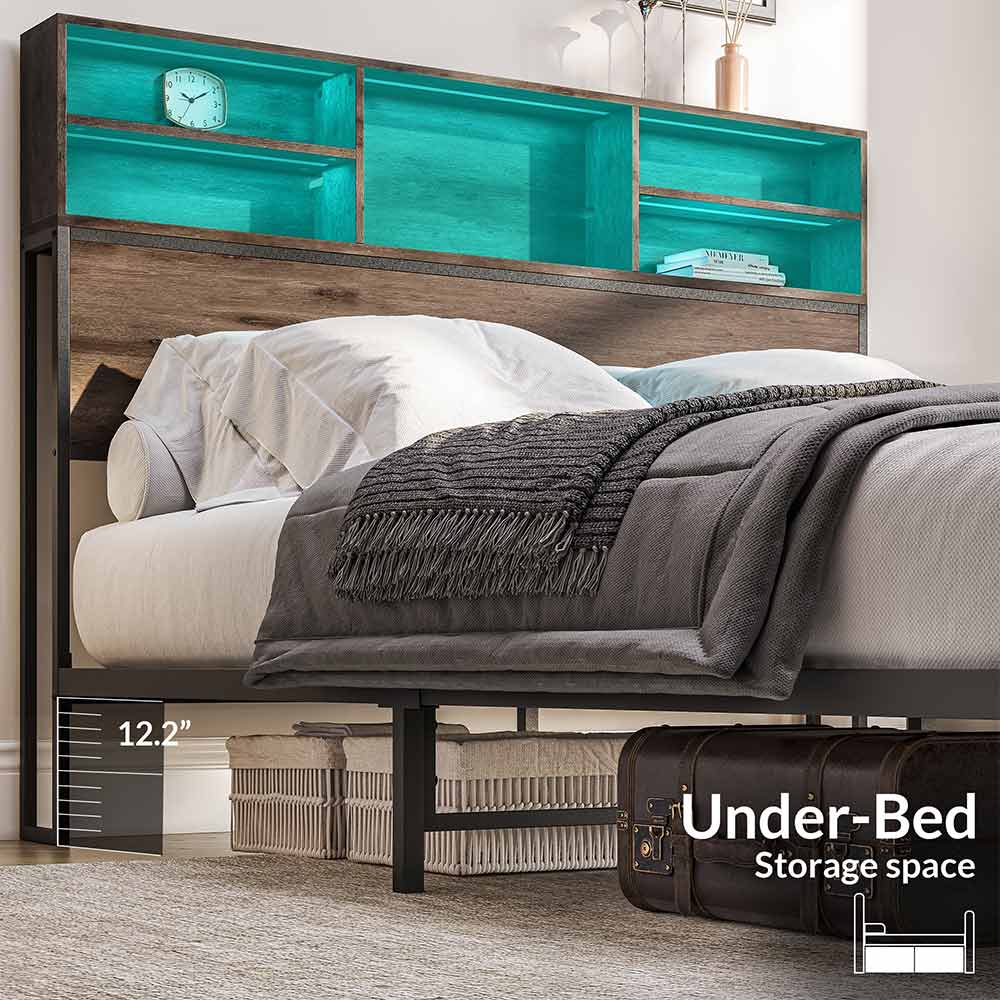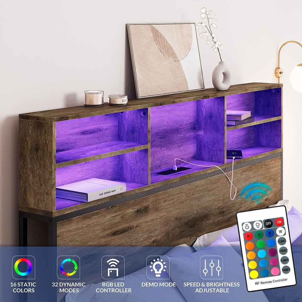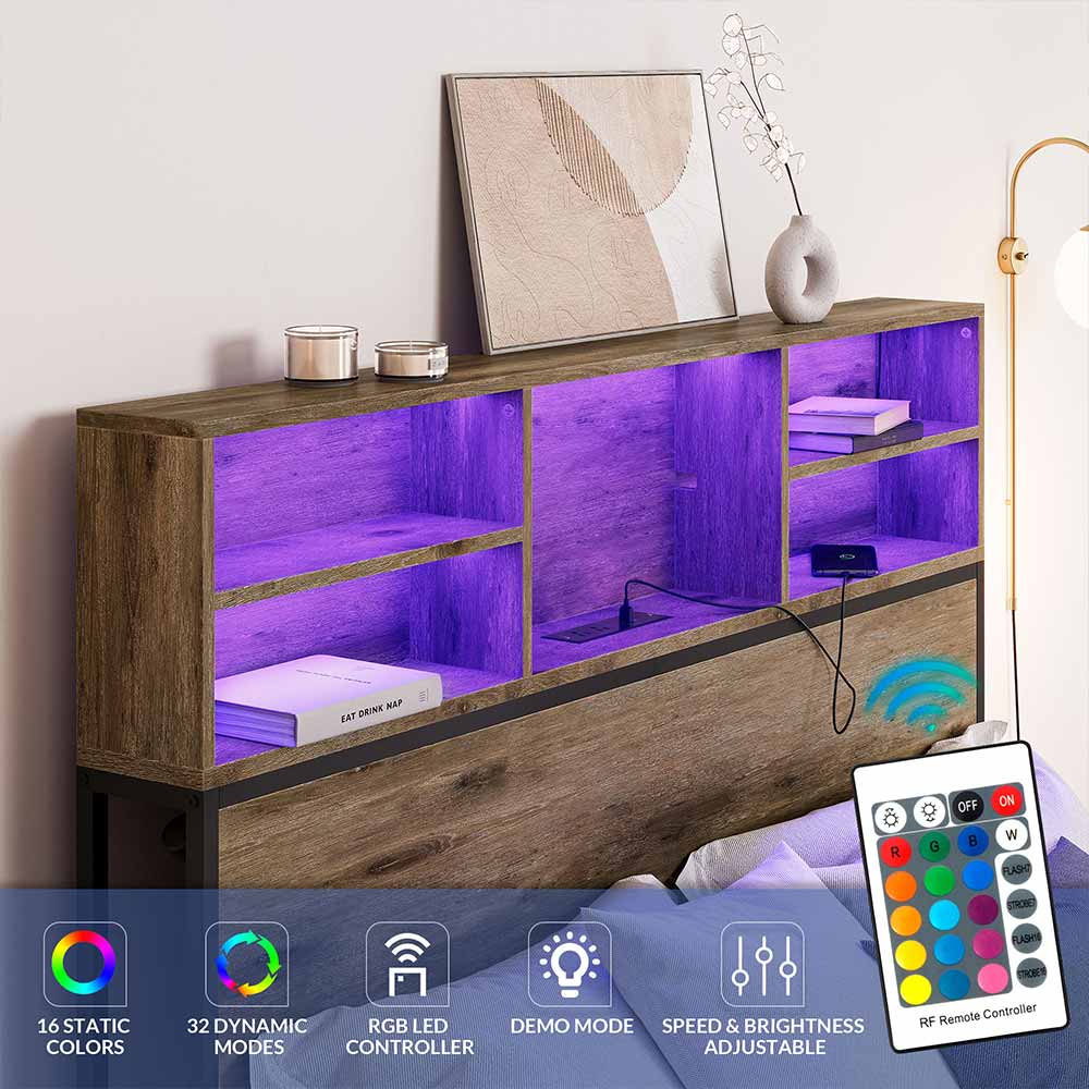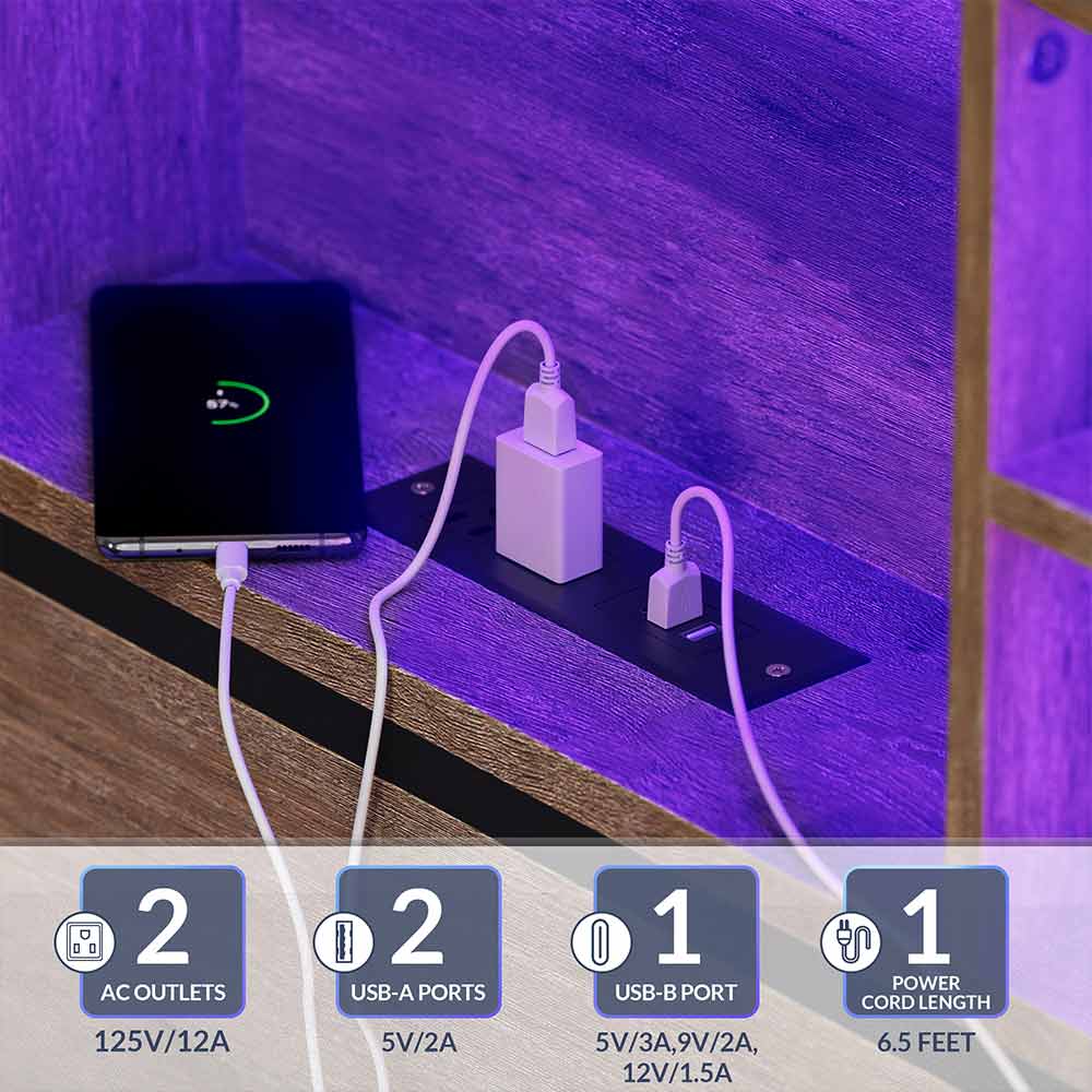 Elevate your bedroom ambiance with the built-in RGB LED display, allowing for custom ambient mood lighting, programmable with the included remote control. Plus, enjoy the convenience of the built-in Charge Station in the middle open shelf of the storage headboard, offering ultra-fast USB Type A/C outlet, 2 AC outlets, 1 standard USB port, 1 fast-charging USB port, and 1 Type-C fast-charging port for all your smart devices and tech gadgets.