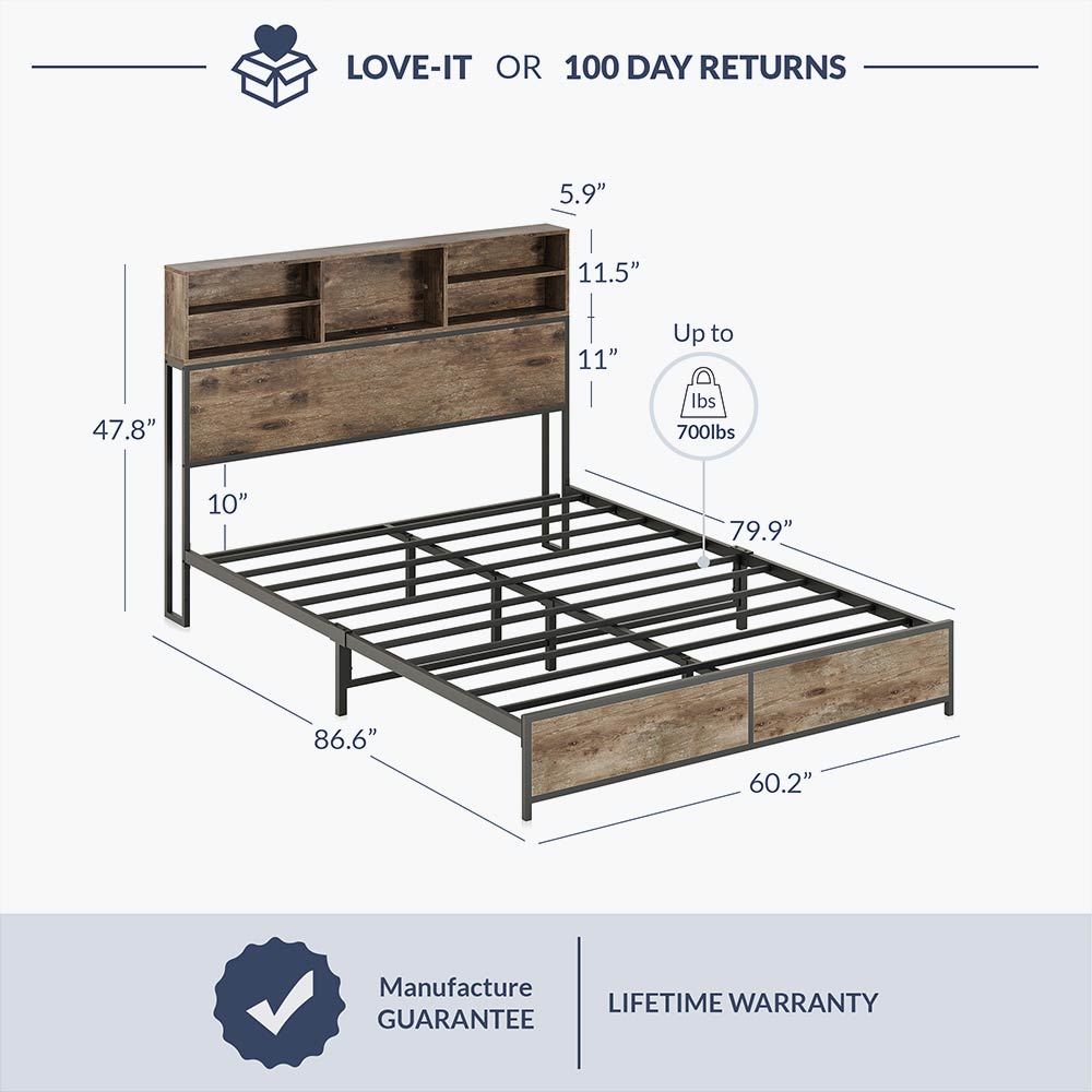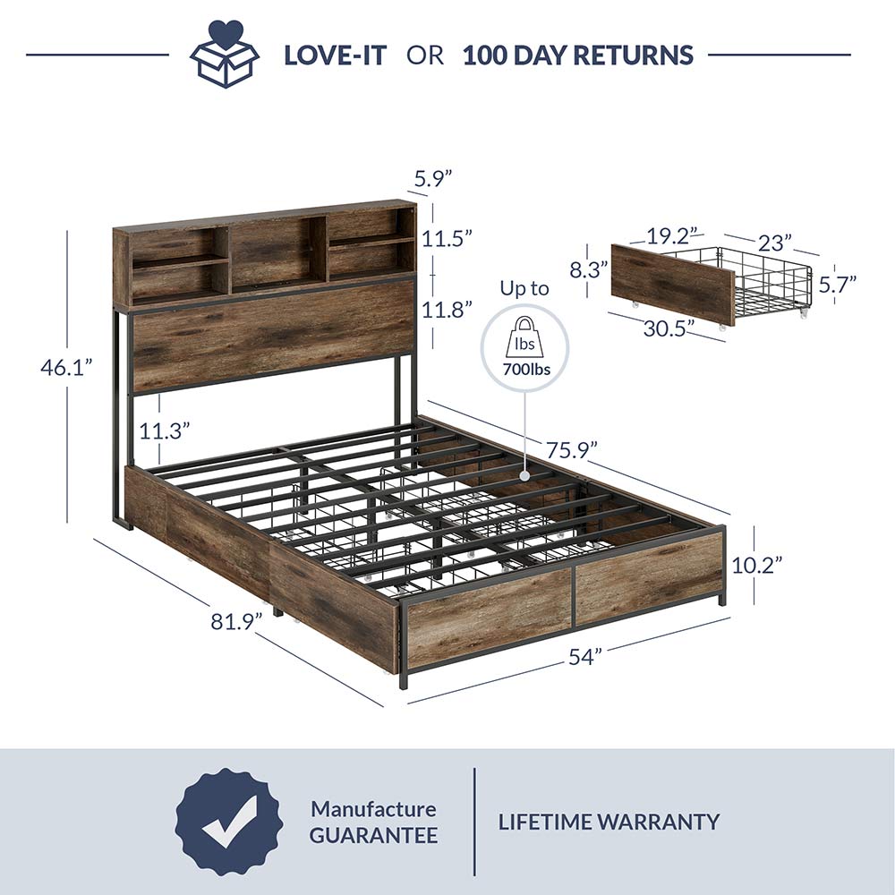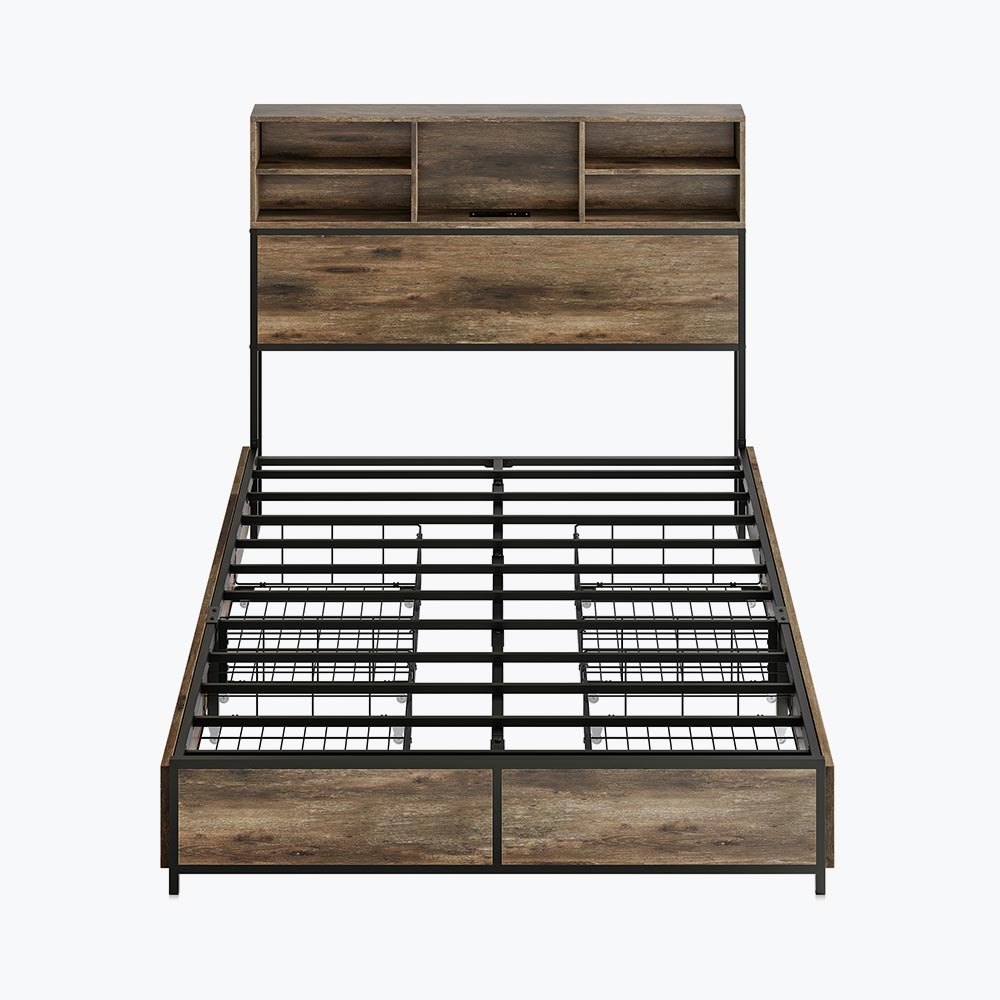 Introducing our exquisite Full Size Storage Bed Frame - a harmonious blend of modern and rustic design. With sleek lines and a clean geometric shape, it exudes a raw rustic charm, all while eliminating the need for a box spring. The four large pull-out drawers beneath the platform bed frame provide generous storage space, boasting inner dimensions of 19.2"(D) x 23"(W) x 5.7"(H) and a maximum weight load of 30 pounds each. But that's not all - the bed frame's headboard features five open drawers and two shelves to enhance your organizational options.