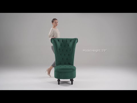 This plush, high-back velvet accent chair creates a bold accent piece that channels gothic, renaissance, and upper Manhattan aesthetics. The wingback silhouette is accented with tufted buttons, adding intricate detail.